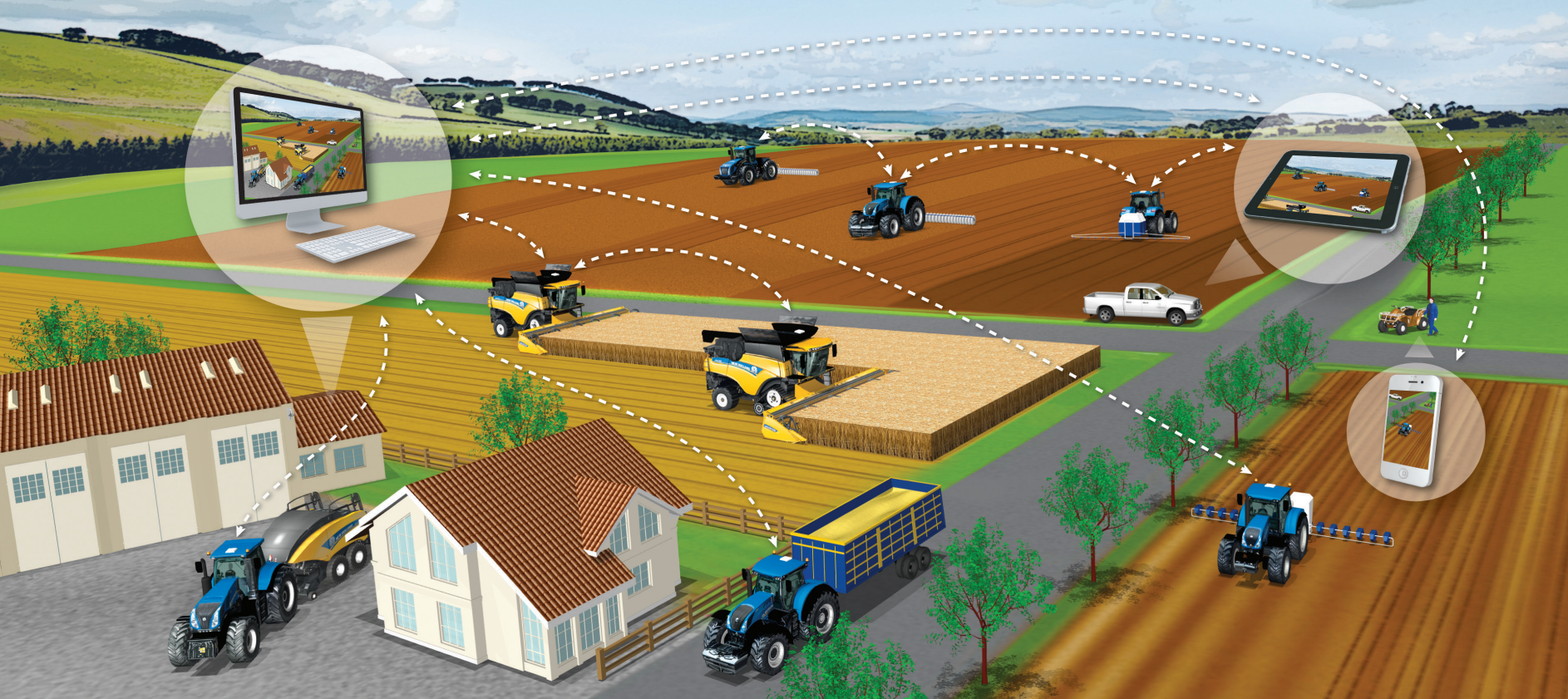 La agricultura está en constante evolución y la toma de decisiones instantáneas puede influir en gran medida en la rentabilidad de su negocio. New Holland se ha fijado el objetivo de localizar a los contratistas y responsables de las explotaciones en cada campo, aun cuando se puedan encontrar a kilómetros de distancia. Ahora esto es posible gracias a la plataforma de gestión de operaciones MYPLMConnect. Mediante tecnología de telefonía móvil, los usuarios reciben información dinámica y en tiempo real de cada uno de los equipos con los que trabajan, pueden monitorear la flota conectada y analizar datos agronómicos.